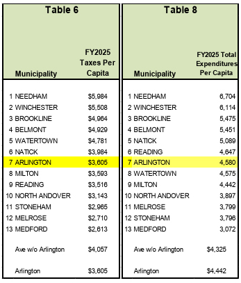 Like many other Massachusetts communities, our town has a structural deficit created by Proposition 2 ½ . This means that costs for providing the same level of services year-to-year rise faster than revenue. Arlington spends frugally — in the bottom half of per capita spending relative to its comparable communities and the bottom half for taxes per capita. Town spending does not create a structural deficit; a lack of revenue does.