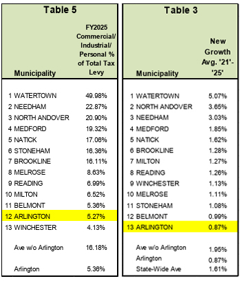 Arlington has and will continue to look for sources of revenue other than residential taxpayers, but our tax base is almost all residential. Commercial and industrial sectors make up less than 6% of the total. For many communities, new growth is an important revenue source. Arlington’s five-and-a-half square mile area is almost completely built out. Our new growth remains at the bottom of comparable communities and falls short of the state-wide average.