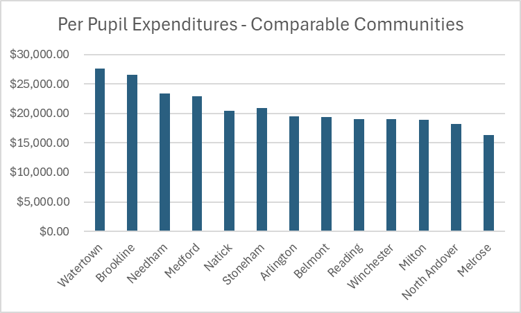 The Massachusetts Department of Elementary and Secondary Education tracks per pupil spending for all districts. In the 2023–2024 academic year, Arlington’s total per pupil spending was $19,471. This is below both the state average ($21,885) and the Town Manager 12 average ($22,682).